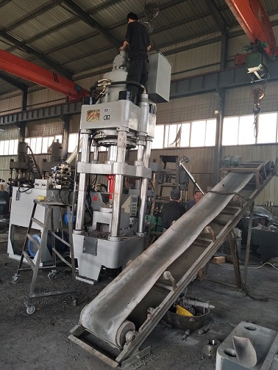有一抽板缸位于主机下模具后面。抽板缸前位时与模套形成模腔底部,后位时底部形成空间,利于饼块落下,同时具有推饼出模具底部的功能。加料缸和加料斗组成自动加料机构。机器的加料由加料缸的往复动作完成。充液系统位于横梁侧面,以补充主油缸快速前进所需的油液。