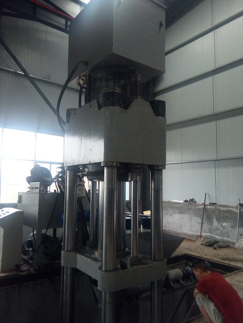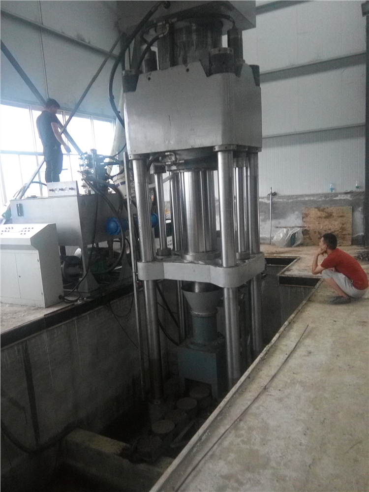 有一抽板缸位于主机下模具后面。抽板缸前位时与模套形成模腔底部,后位时底部形成空间,利于饼块落下,同时具有推饼出模具底部的功能。螺旋加料装置和加料斗组成自动加料机构。机器的加料由螺旋加料装置完成。充液系统位于横梁侧面,以补充主油缸快速前进所需的油液。