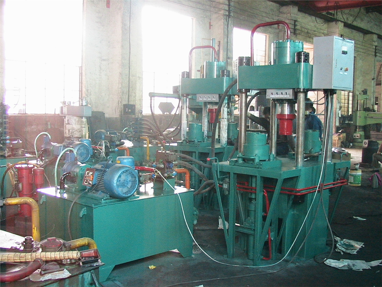 上下横梁由立柱和螺母联接,主液压缸前端用法兰联接在横梁底部。模具固定在下横梁上,模套固定在模具内。冲头直接联接在油缸活塞杆顶端。模套和冲头均可拆卸和更换。有一抽板缸位于主机下模具后面。抽板缸前位时与模套形成模腔底部,后位时底部形成空间,利于饼块落下,同时具有推饼出模具底部的功能。