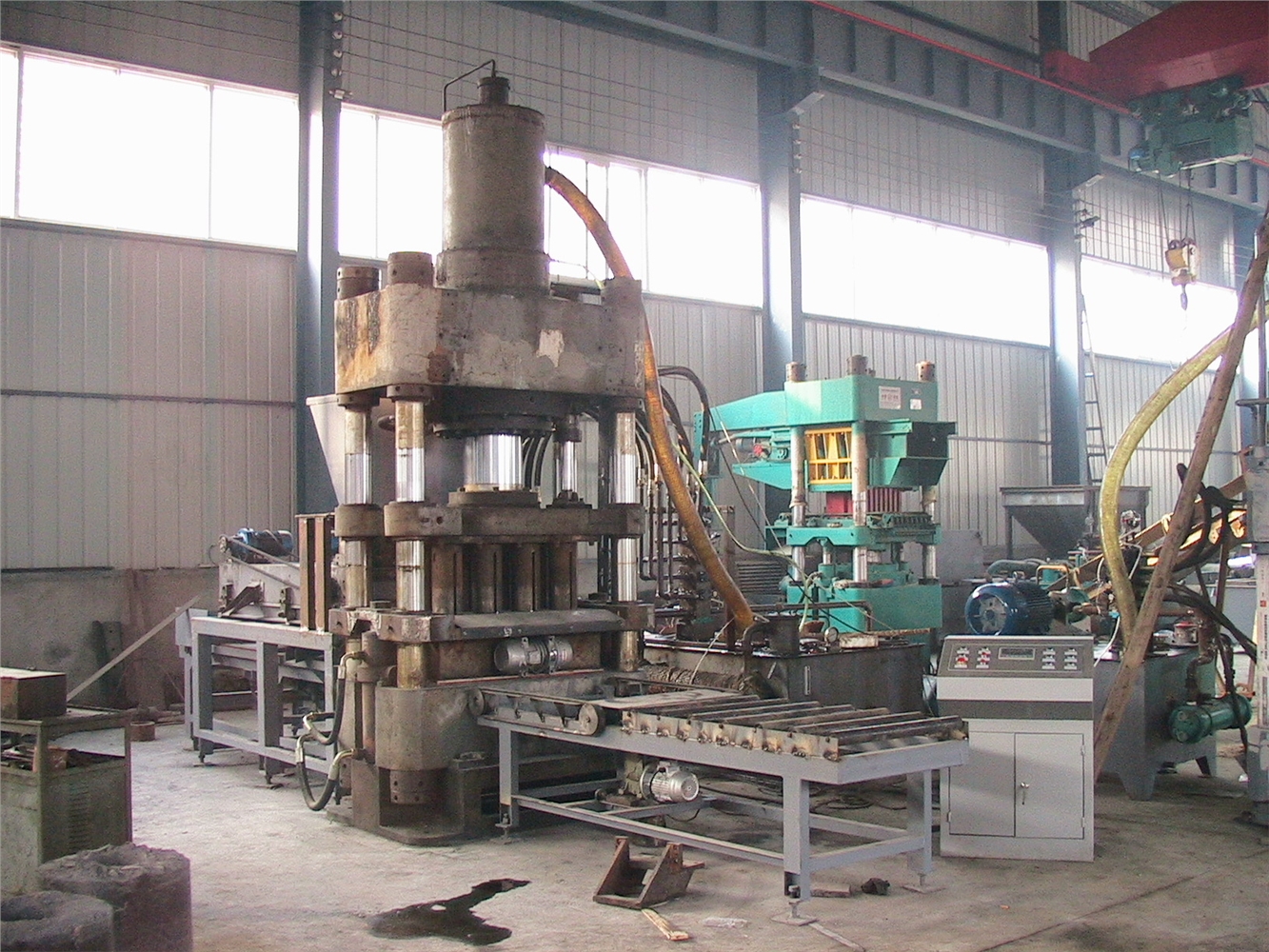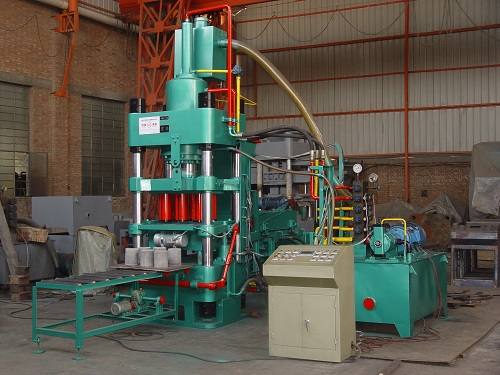 南昌铁粉压块机定压”和“定程”工艺技术:人机介面的调整来实现自动控制,完整的动作,准确的定位,巨大的压力,把不同的铁粉、氧化铁皮等原材料,通过不同的颗粒配比,更换不同的模具,压制成标准和非标准的实心和空芯形块,是中小型压块企业在生产过程中理想的压块成型设备。 上下横梁由立柱和螺母联接机座组成一个刚性的机架,主液压缸的前端用法兰连接在上梁的中部,中板固定在活塞杆顶端,并连接固定上冲头,依靠滑套在立柱上滑动。模具通过滑动板连接在顶出缸上,,被固定在下梁两侧在立柱上滑动,模套固定在模腔内,是成形制块的主要部分。
