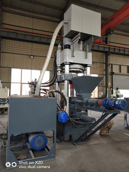 磨削泥压块机因磨床泥本身流动性差,且含有乳化液,造成其送料机构的特殊性,大大区分于其他金属屑压块机的送料机构,根据其原料本身的差别,送料机构需为螺旋送料,并且加装乳化液收集装置。螺旋送料装置和加料斗组成自动加料机构。机器的加料由螺旋自动送料装置的动作完成。充液系统位于横梁侧面,以补充主油缸快速前进所需的油液。