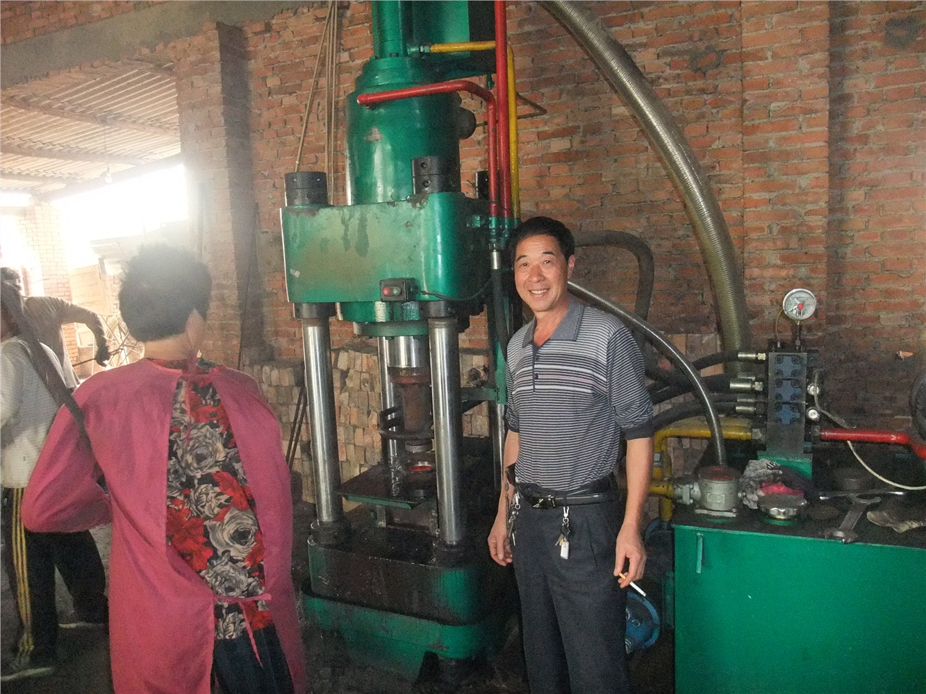 河南鑫源液压全自动热压机加工工艺为:先把原料冷压成直径100mm的块,再把压成的冷压块放到进隧道窑平台,启动顶车机,把冷压块推进隧道窑,启动鼓风机,把火炉里的火吹进隧道窑,把原料烧红900℃左右,启动顶车机,把烧红的块顶到固定位置,用特制工具加入热压机压块机,启动热压机完成压块动作。
