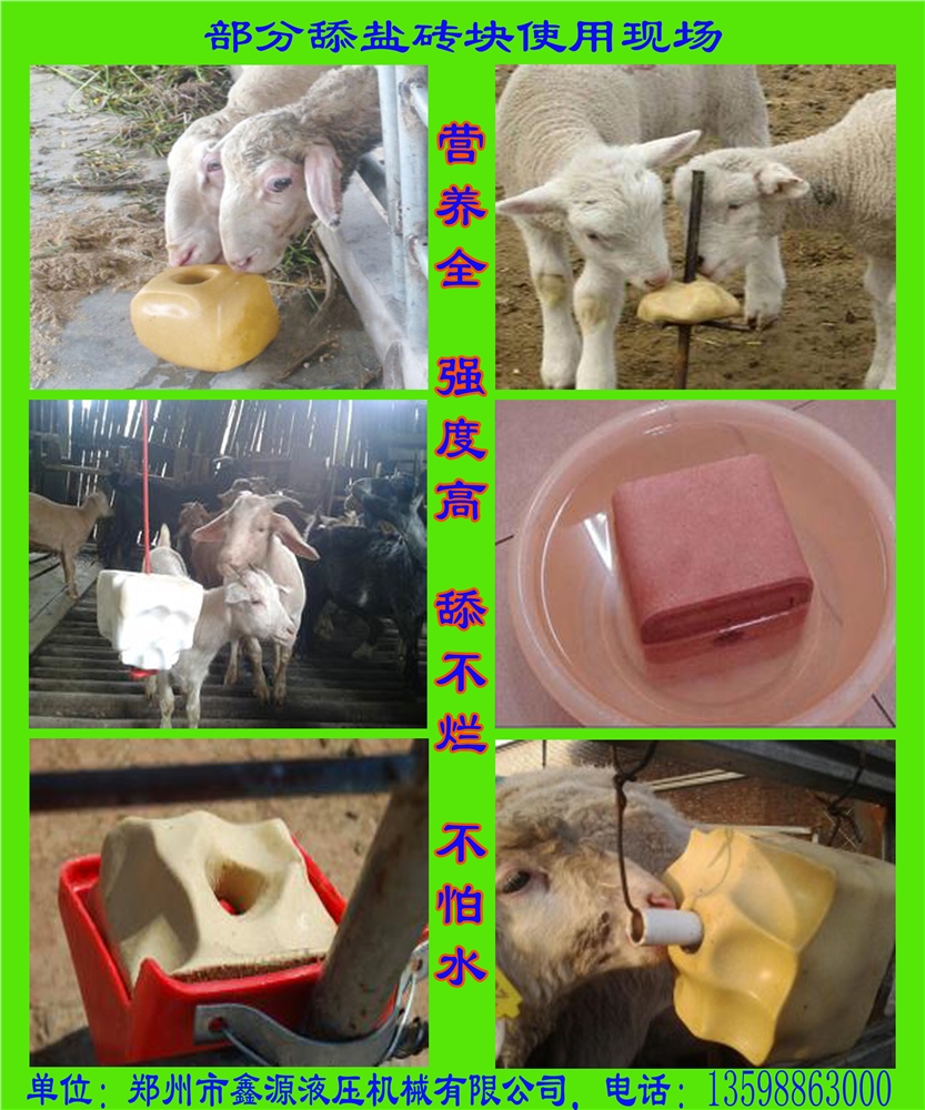 舔盐砖压块机是将牛羊等大牲畜所需的矿物质元素、维生素等微量元素、营养物质经科学配方,经舔盐块压块机加工成块状、饼状及其它特殊形状,供牛羊舔食的一种饲料,其形状不一,有的呈圆柱形,有的呈长方形、方形不等。也称块状复合添加剂,通常简称“舔块”或“舔砖”。理论与实践均表明:补饲舔盐块能明显改善牛羊健康状况,加快生长速度,提高经济效益。上世纪80年代以来,舔盐压块机已广泛应用于60多个国家和地区,被农民亲切地称之为“牛羊的巧克力” ,被誉为畜牧业的“保健品”。