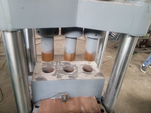 上下横梁由立柱和螺母联接,主液压缸前端用法兰联接在横梁底部。模具固定在下横梁上,模套固定在模具内。冲头直接联接在油缸活塞杆顶端。模套和冲头均可拆卸和更换。