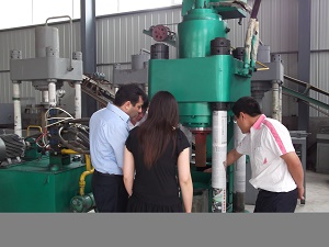 立式铝屑压块机实现挤压回复出饼等动作。系统压力由溢流阀调定,全自动机械动作由电脑控制,自动运行。主缸将饼块压实后压力继电器发讯,然后执行下一个动作。