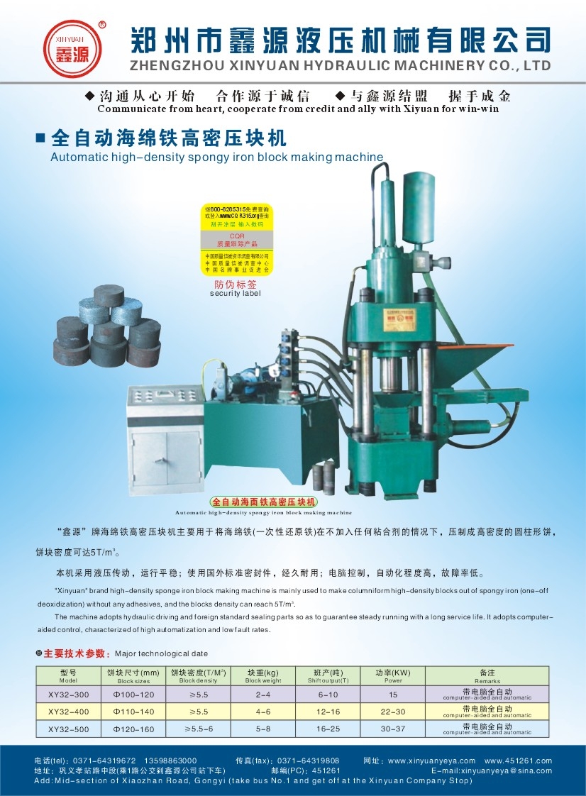 “鑫源”牌全自动铁粉压块机压制后的铁粉可以直接装罐,烧制成海绵铁,与传统手工装罐相比具有还原速度快,节约能源,而且产量高,延长耐火罐的使用寿命等特点。而且还原后的海绵铁密度也大过普通手工装罐的海绵铁。本机为四柱式压力机,机架部分采用整体铸钢件,提高了设备的可靠稳定性和使用的寿命。