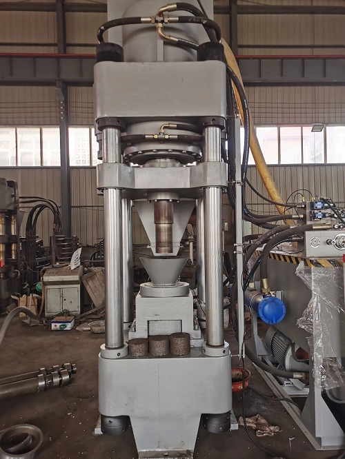 金属废料压块机结构紧凑,收集操作方便,能快速的将各种金属废料挤压成块状,提高金属废料的使用和运输效率,降低劳动强度,满足生产和使用的需要。
